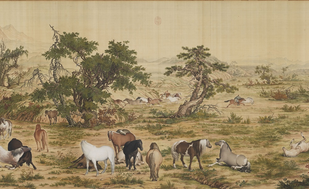 《百骏图》是清代宫廷画家郎世宁的经典画作,以中西融合的笔法生动描绘了百匹骏马的动态,展现了极高的艺术价值。