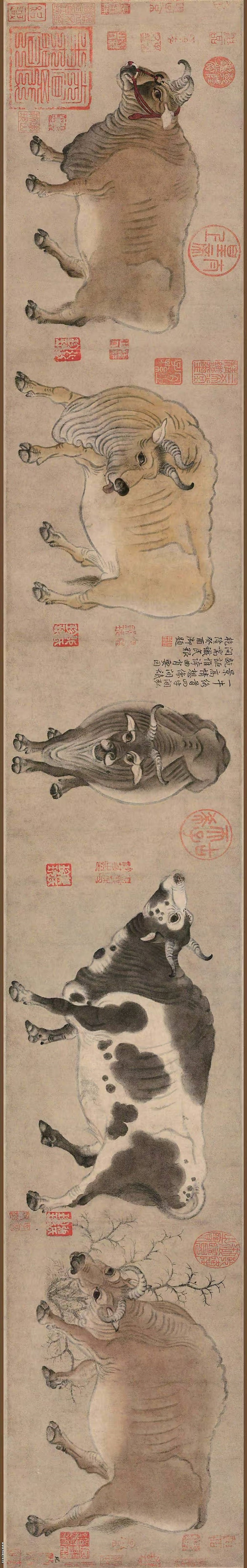 材质与保存。《五牛图》绘于唐代宫廷特制麻纸上,历经千年仍保存完好,成为研究唐代绘画材料与装裱技术的重要实物。其修复技术(如“揭画心”“全色接笔”等)更是中国古代书画修复的典范。