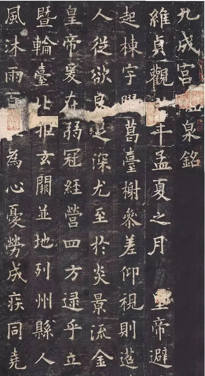 《九成宫醴泉铭》是唐贞观六年(632 年)由魏征撰文、书法家欧阳询书丹而成的楷书书法作品,碑刻者不可考,现存于陕西麟游县博物馆(一说碑亭景区)。此碑高 2.7 米,厚 0.27 米,上宽 0.87 米,下宽 0.93 米,全碑共二十四行,每行四十九字。碑首有六龙缠绕,正面隶书“九成宫醴泉铭”六个大字。该碑文记叙了唐太宗在九成宫避暑时发现醴泉之事,叙述了“九成宫”的来历和建筑的雄伟壮观,歌颂了唐太宗的武功文治和节俭精神,介绍了宫城内发现醴泉的经过,并刊引典籍说明醴泉的出现是由于“天子令德”所致,最后提出“居高思坠,持满戒盈”的谏诤之言。
