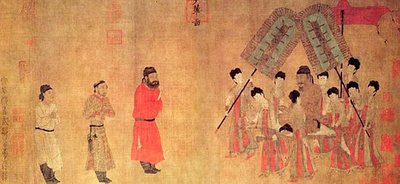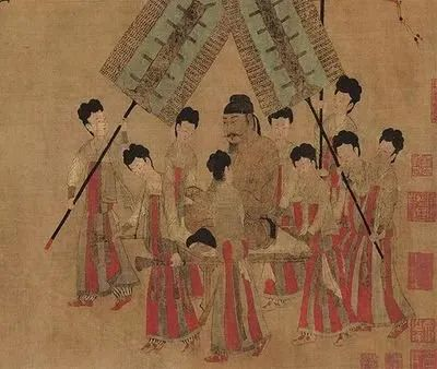 比例艺术:唐太宗与宫女的比例刻意夸张,这种"主大从小"的构图手法是古代人物画的常见表现方式。